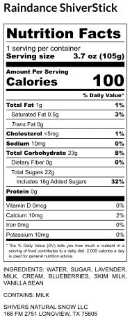List of Ingredients : Water, Sugar, Blueberries, Milk, Cream, Heavy Cream, Lavender, Vanilla Bean.